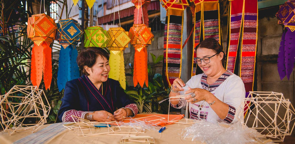 Join the fun activity of preserving the ancient Lanna lantern-making tradition at Baan Khom Kham, a place with a fascinating history! You will learn and craft your own lantern with friendly experts guiding every step (no worries if you're a beginner). Enjoy delicious snacks and drinks, and finally, take "your own Lanna lantern" home as a beautiful souvenir!